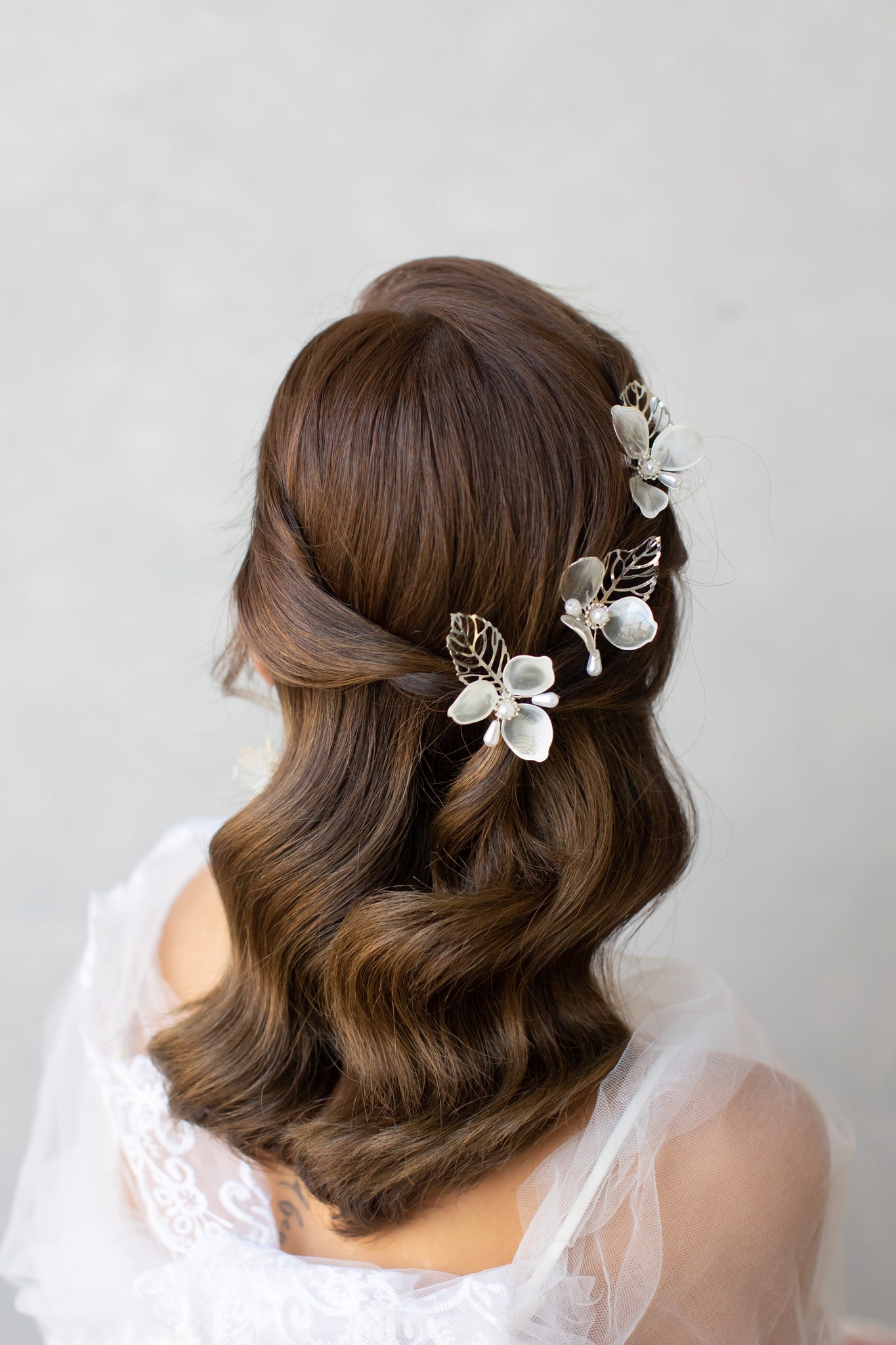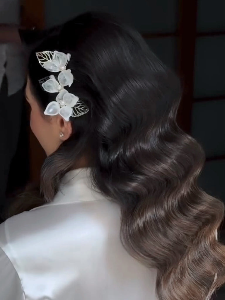 Un bellissimo set che di sicuro aggiungerà eleganza, raffinatezza e stile a qualsiasi acconciatura. Fiori fatti a mano con vetro liquido e perle di Maiorca. Adatto per qualsiasi evento speciale. Abbinabili con orecchini "Selena".