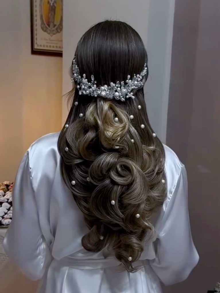 Facile da abbinare con qualsiasi tipo di acconciatura. Questo tralcio è creato a mano con un filo argentato, perle, strass di Zirconi e tanti cristalli Swarovski.